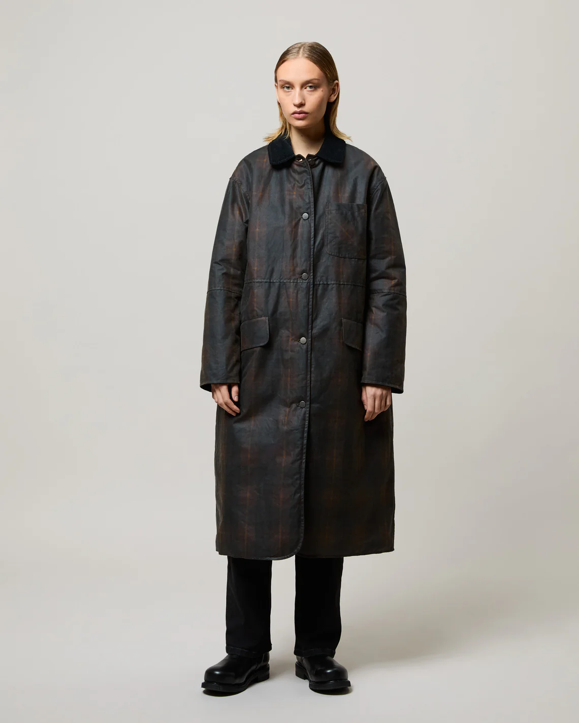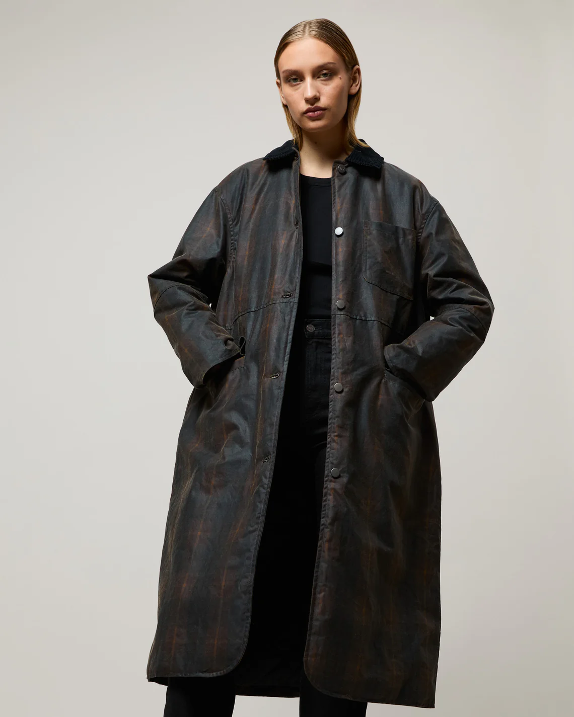 Lange gewatteerde gewaxte jas voor dames van het Zweedse merk Brixtol Textiles. De Joan Jett is gemaakt van biologisch katoen, gecertificeerd door BCI, en behandeld met een waterbestendige wax in Dundee, Schotland.