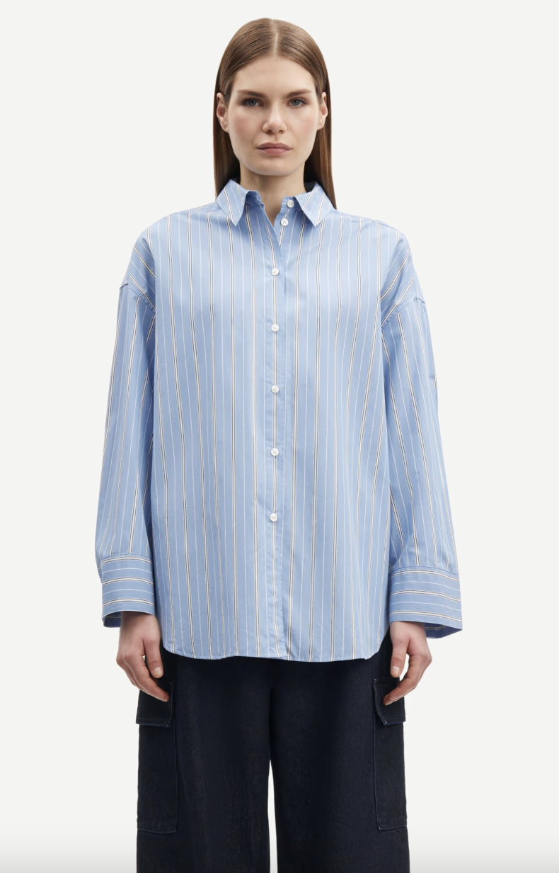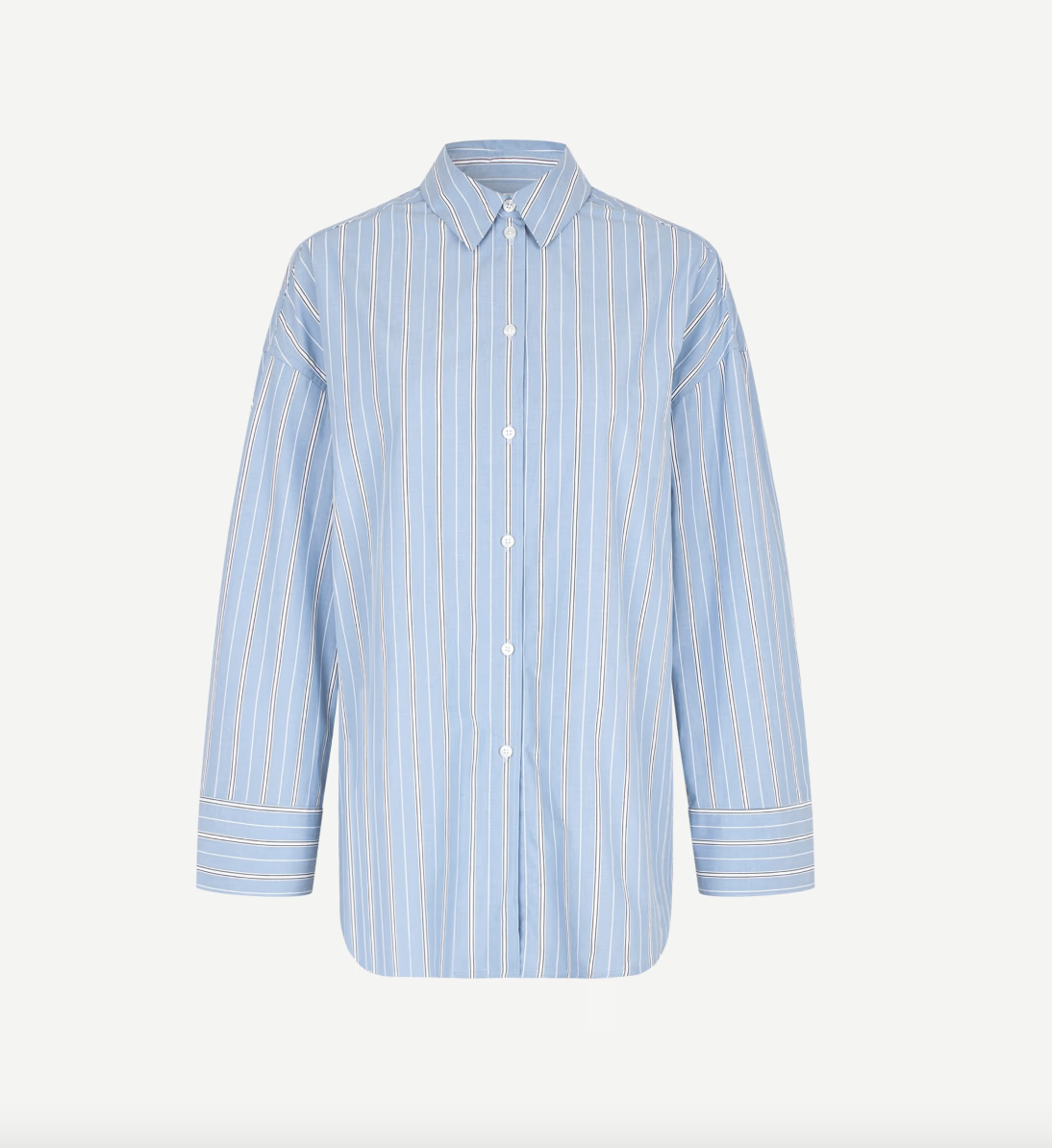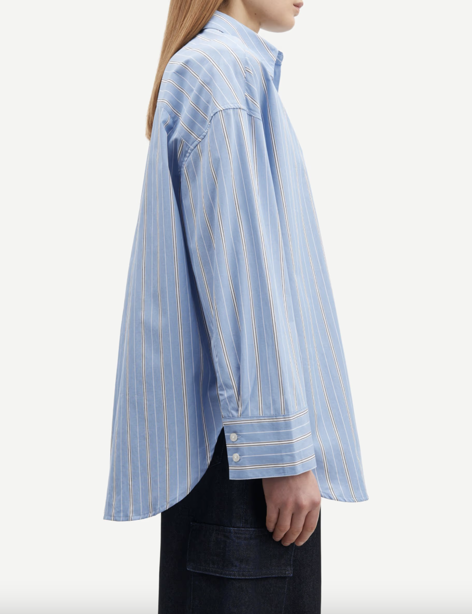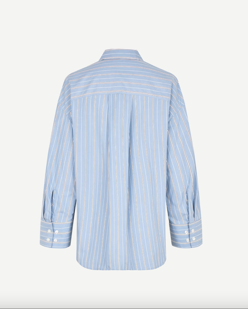 Samsoe Samsoe krijtstreep longsleeve shirt in lichtblauw een losvallende essential gemaakt van 100% biologisch katoen. Met verlaagde schouders, wijde mouwen en een puntige kraag is het moeiteloos chic met een duurzaam vervaardigd randje.