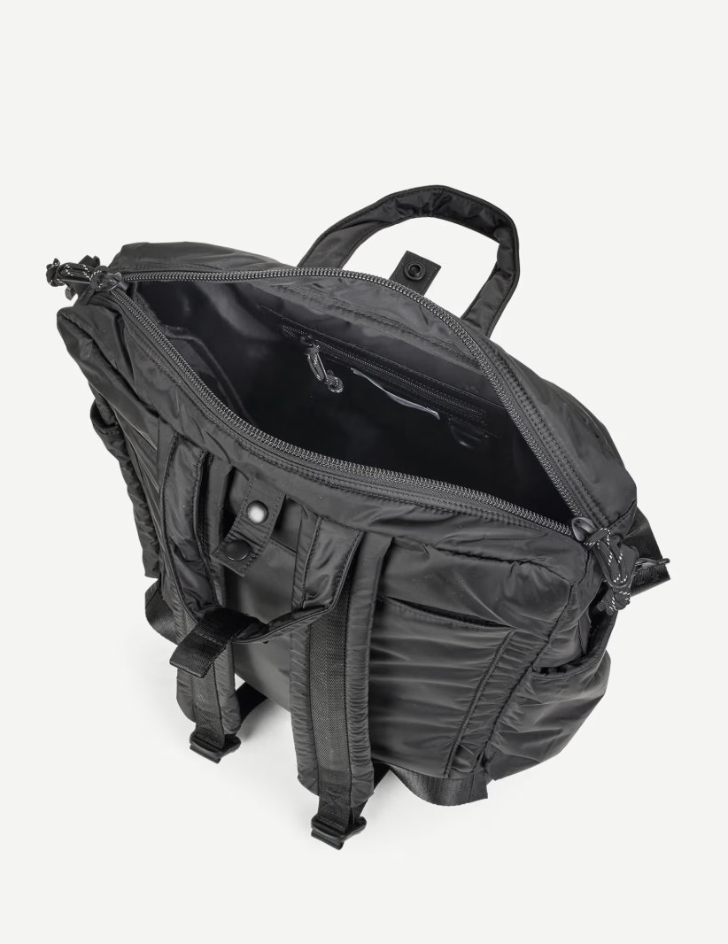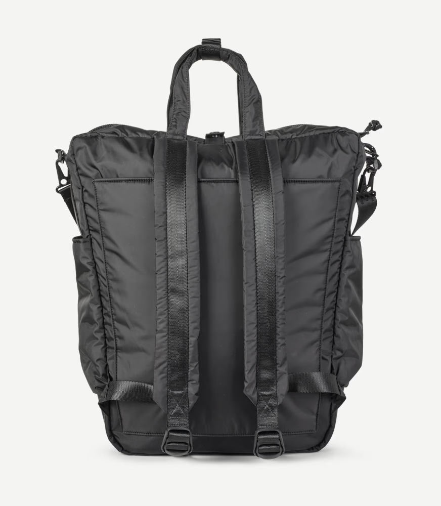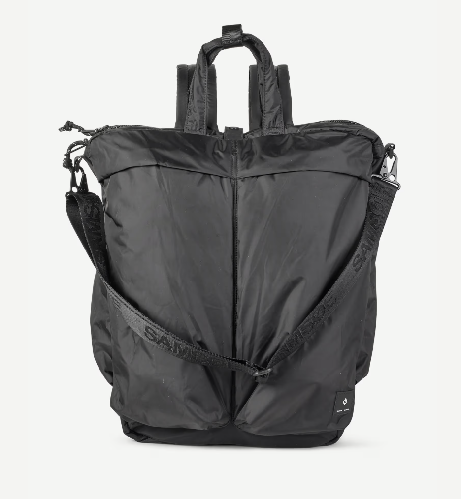 Samsoe Samsoe veelzijdige helmtas in het zwart, gemaakt van 100% gerecycled polyester. Met handgrepen, rugzakriemen en een afneembare schouderriem.