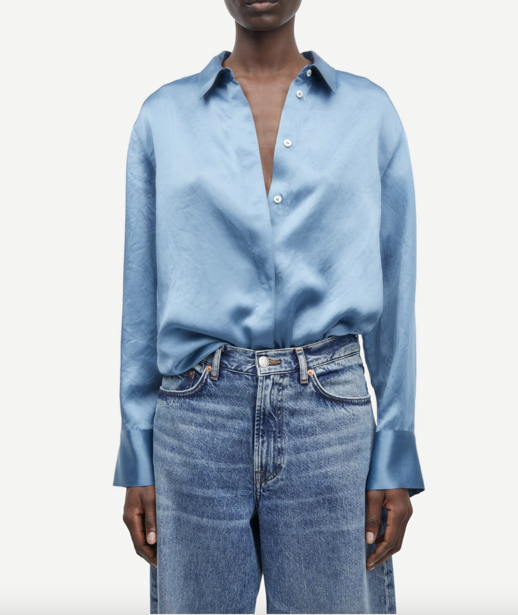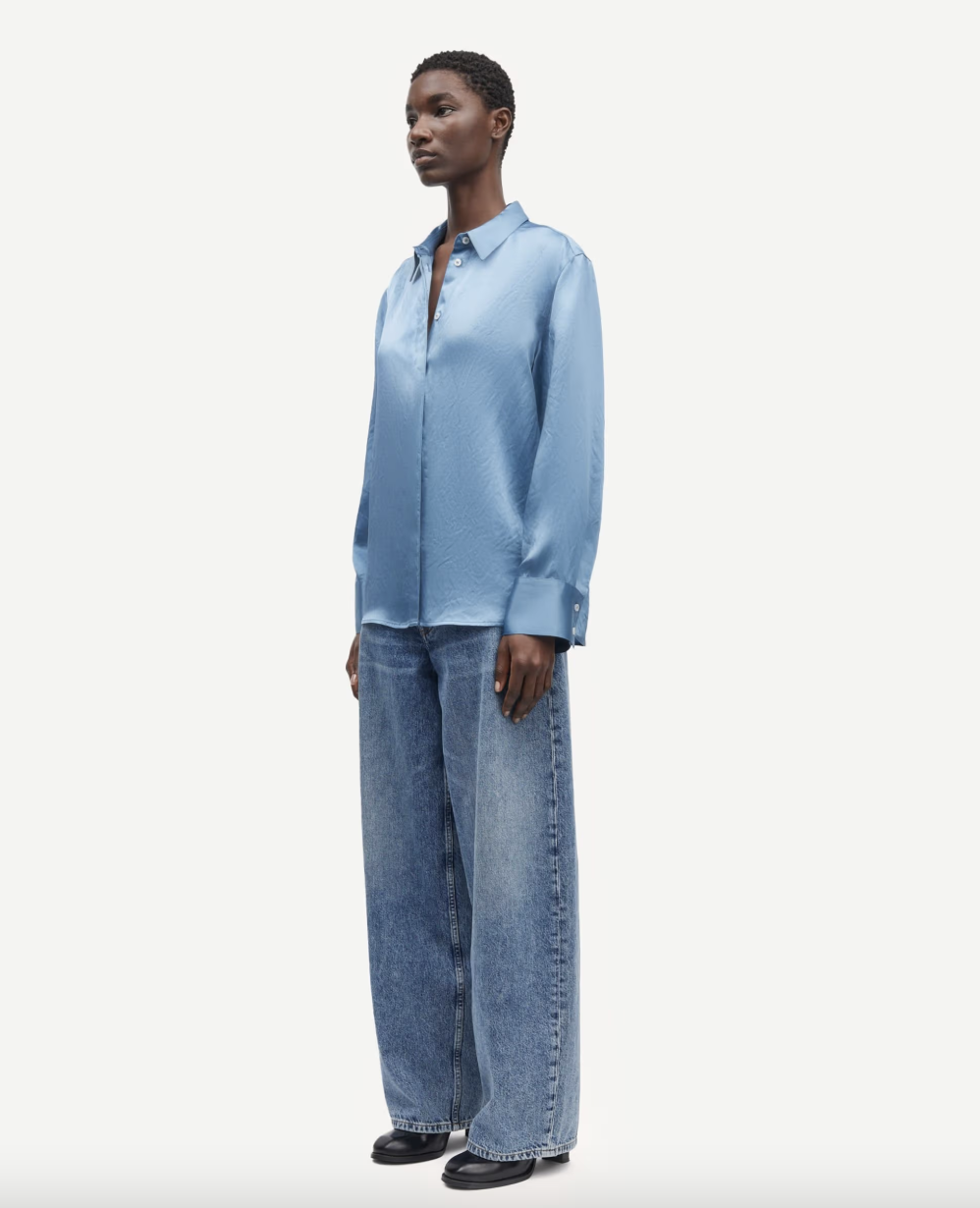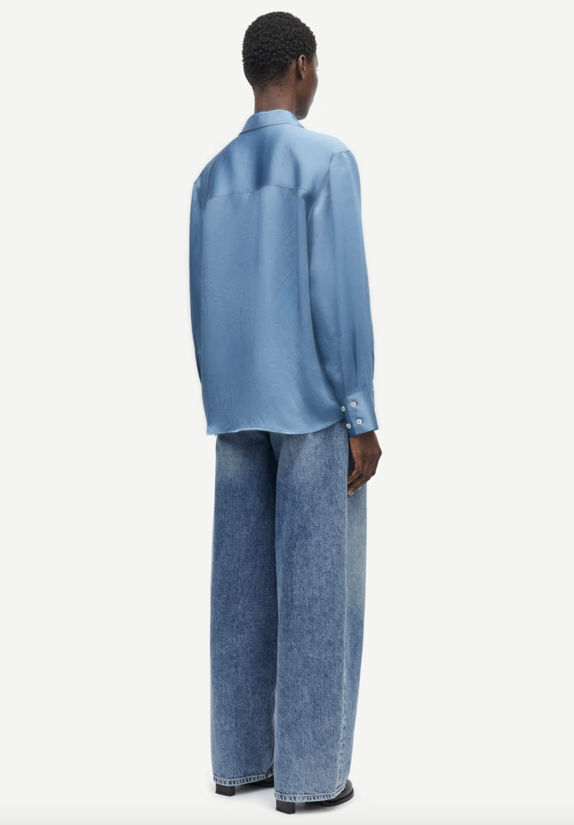 Samsoe Samsoe gekreukt satijnen shirt met lange mouwen in metallic blauw met een losse pasvorm en verlaagde schouders voor moeiteloze elegantie. Met een verborgen knoopsluiting en geplooide rug combineert dit 100% Naia™ Acetaat shirt luxe met dagelijkse s...